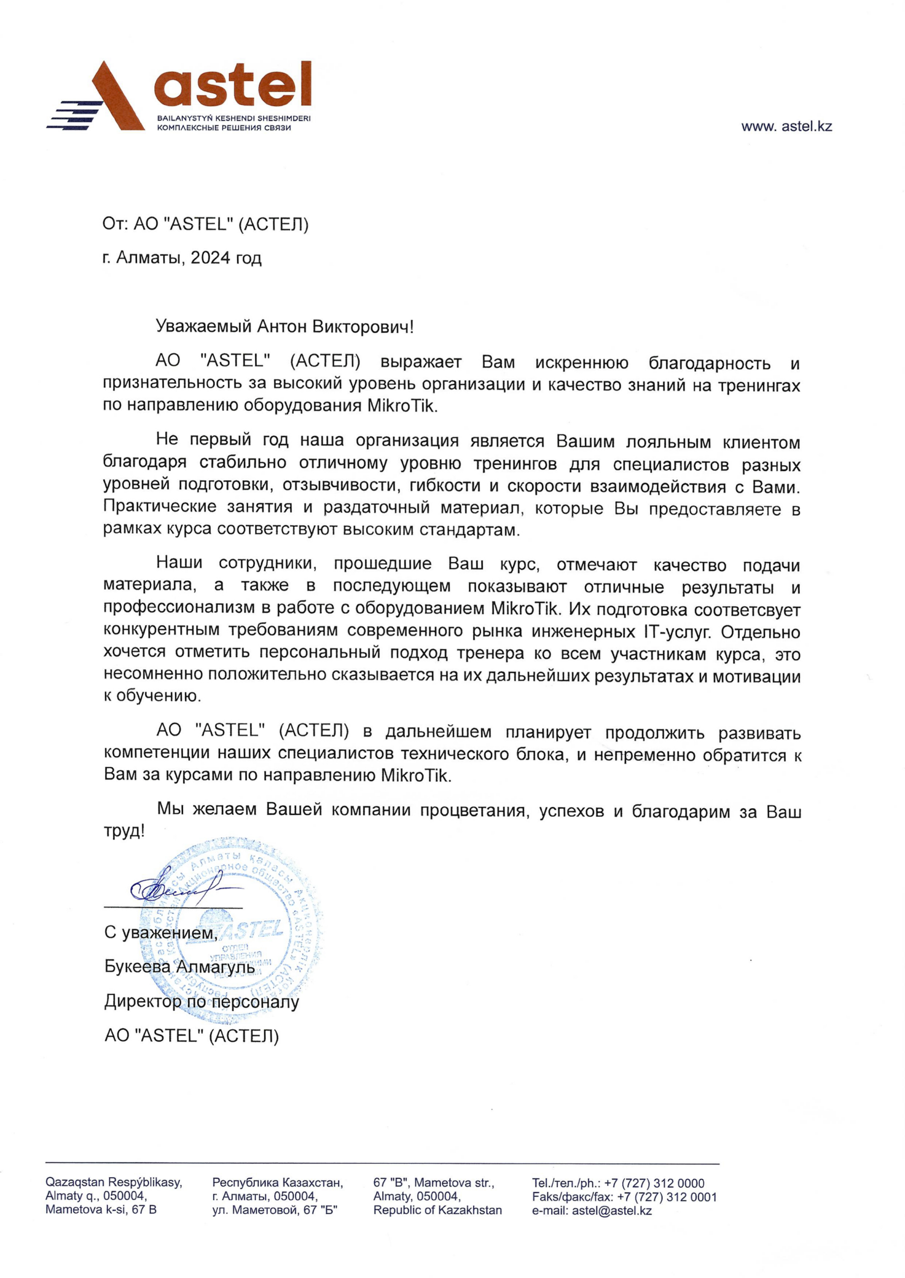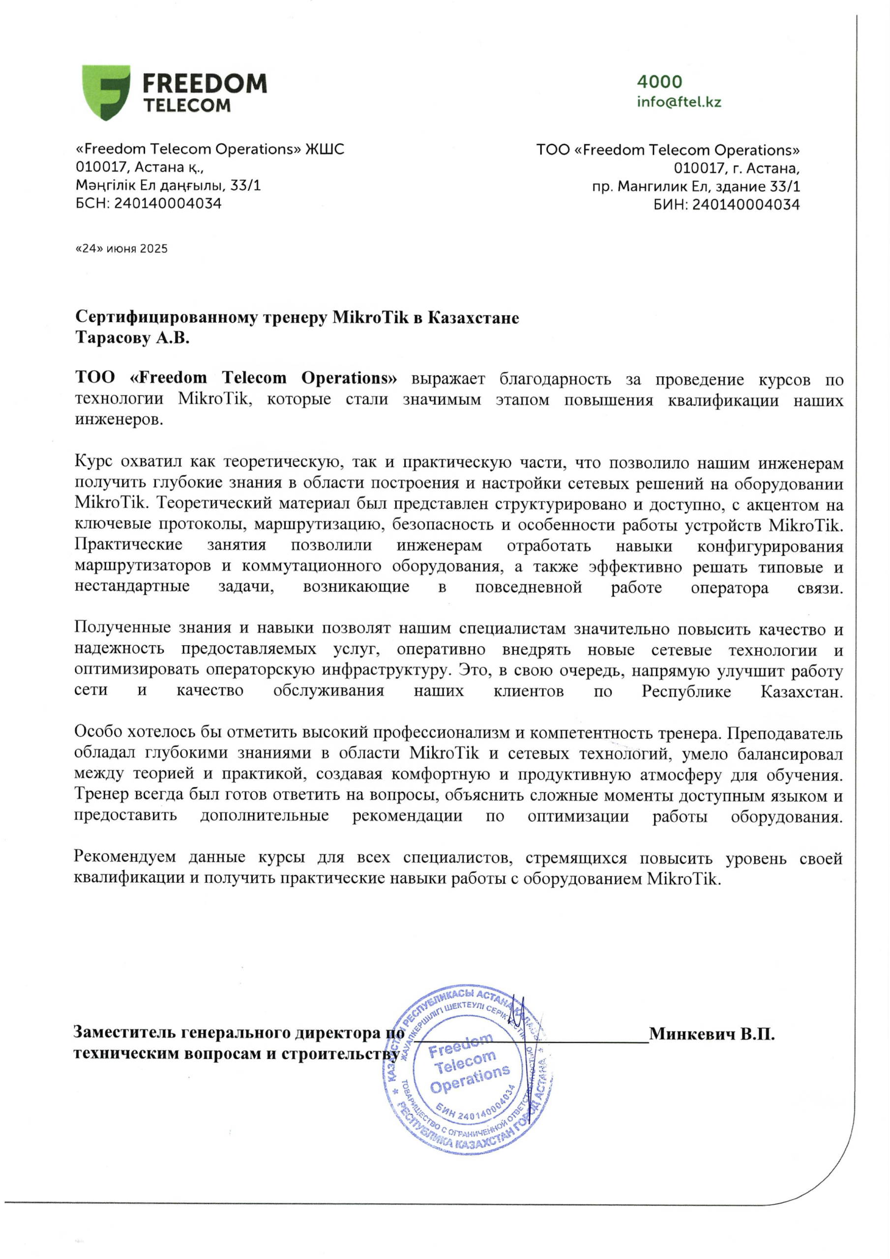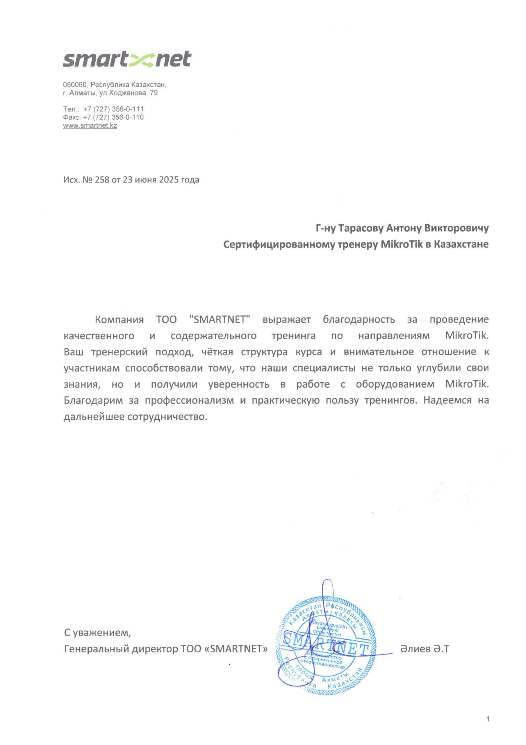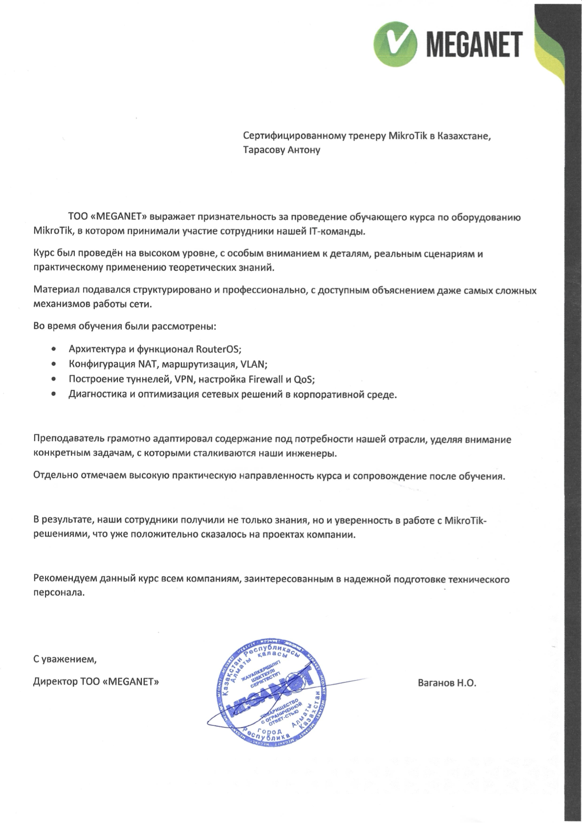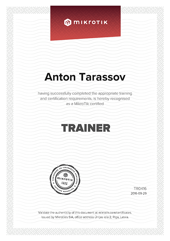 - Сертификаты: 10 из 10 возможных сертификатов в программе обучения MikroTik (можно проверить по ссылке: https://mikrotik.com/certificateSearch введя Anton Tarassov в поле «Number or a Person»).