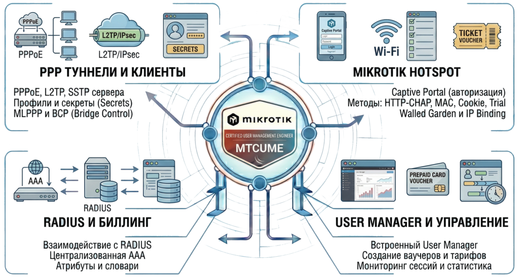 MTCUME (MikroTik Certified User Management Engineer) — это инженерный курс, посвященный централизованному управлению пользователями, настройке сервисов авторизации и созданию масштабных сетей доступа.