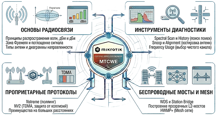 MTCWE (MikroTik Certified Wireless Engineer) — это инженерный курс, посвященный углубленному изучению радиосвязи и построению беспроводных сетей.